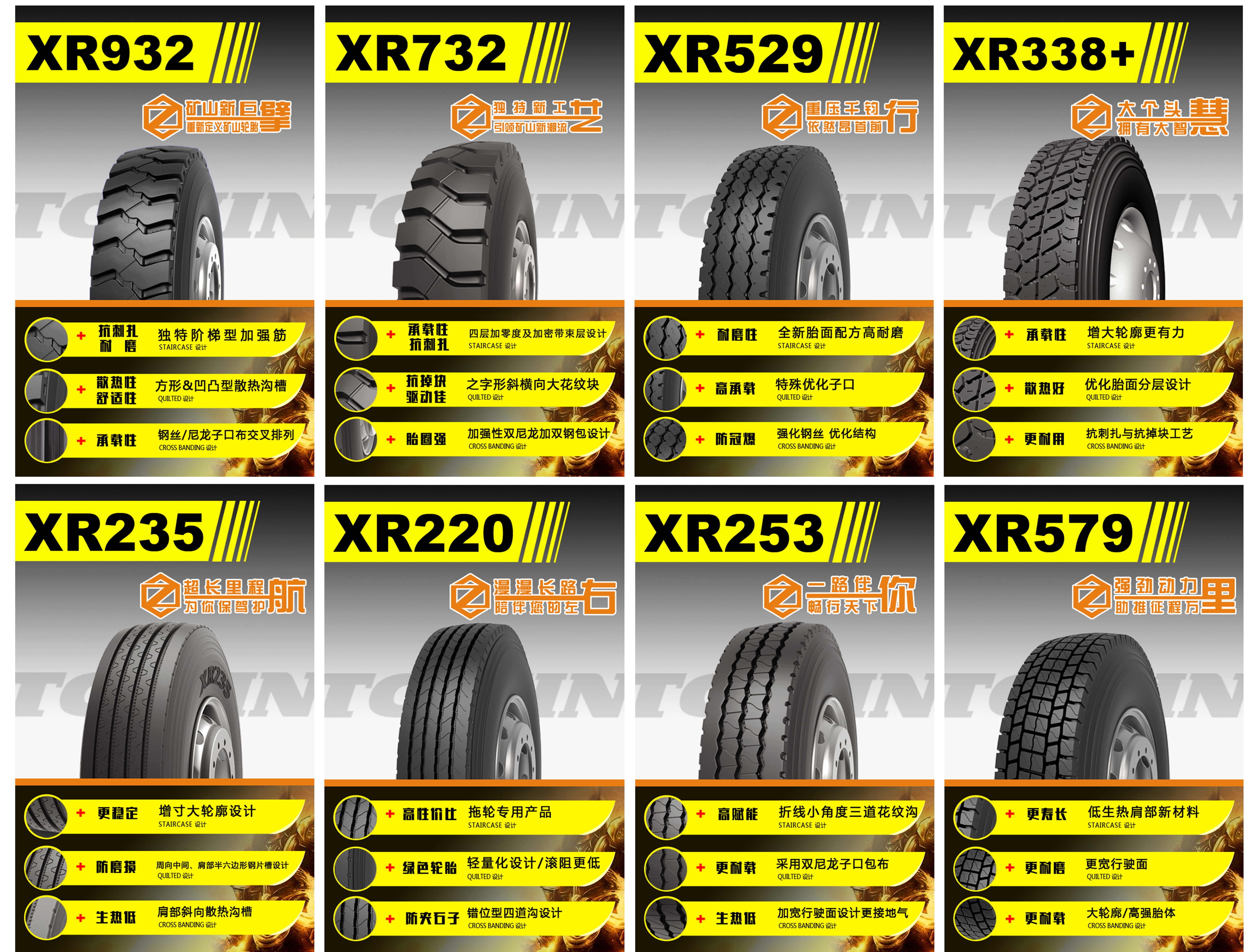 XR932具備獨(dú)特的階梯型加強(qiáng)筋設(shè)計(jì),輪胎更抗刺扎、更耐磨,使用壽命更長(zhǎng),方形&凹凸型散熱溝槽,有效增強(qiáng)輪胎散熱性、舒適性,通過(guò)優(yōu)化鋼絲/尼龍子口布交叉排列,使輪胎具有卓越的承載性能。